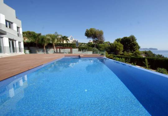 Villa in erster Meereslinie in Calpe, Costa Blanca, mit Strand Zugang. Neubau Designer Villa in gehobener Urbanisation in Calpe mit Panorama blick. Dieses fertig gestellte Luxusanwesen liegt malerisch direkt über dem Meer in exklusiver Lage in Calpe, sehr nahe an dem Stadtzentrum, das in wenigen Minuten zu erreichen ist. Das bestechende moderne Design und die Materialien die verbaut wurden befinden sich auf höchstem Niveau und lassen keine Wünsche offen. Fußbodenheizung, Marmorböden, Infinity Pool, und jeder erdenkliche Luxus sind